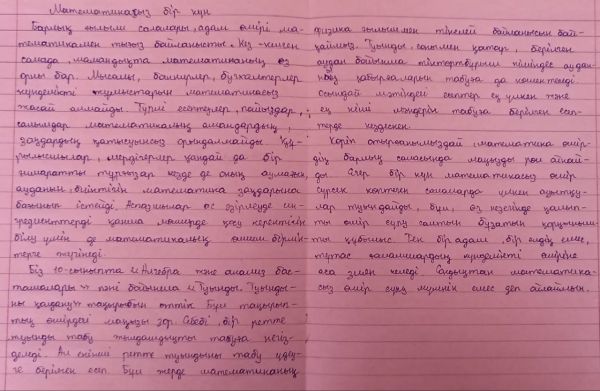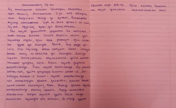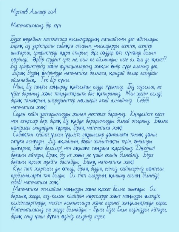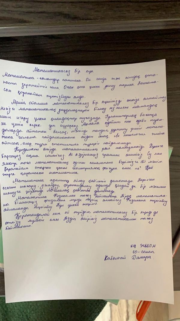 26.01 күні «Математика айналамызда» атты математикалық сауаттылық апталығы аясында 10-11сыныптар арасында «Математикасыз бір күн» тақырыбында эссе байқауы өтті. 10-cынып оқуш…