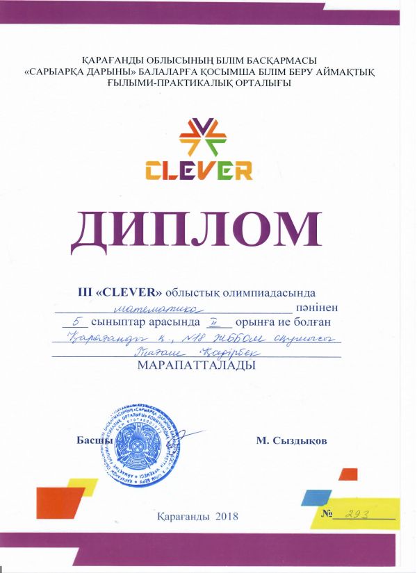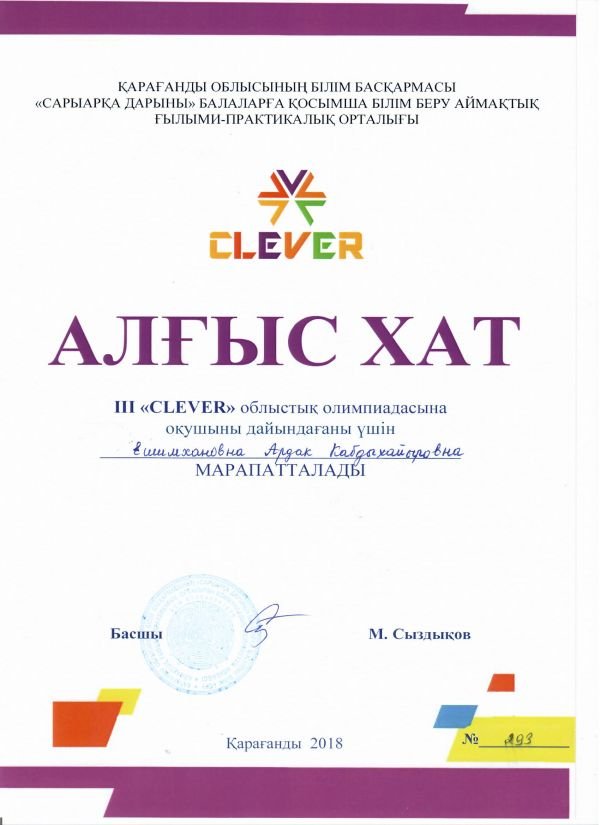 Поздравляем Закария Арубегім , ученицу 6 класса , за занятое 1-место по казахскому языку, Бактыбаеву Алину , ученицу 4-класса за 2-место по математике, Тағаш Қадірбек , ученика 5-класса за зан…