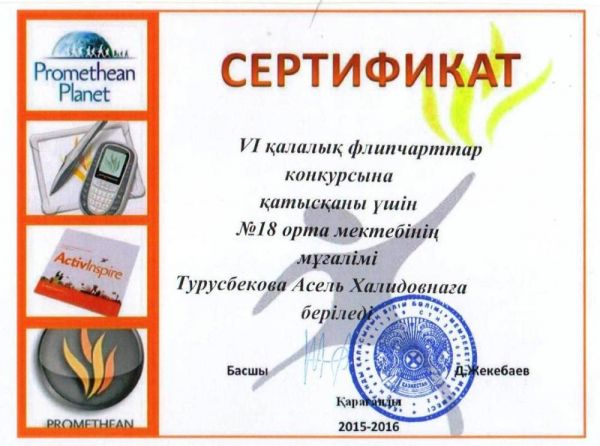 Учителя информатики школы №18 Ешкеева Айжан Атаевна и Турусбекова Асель Халидовна, награждены сертификатами участия в VI городском конкурсе флипчартов, организованном Отделом…
