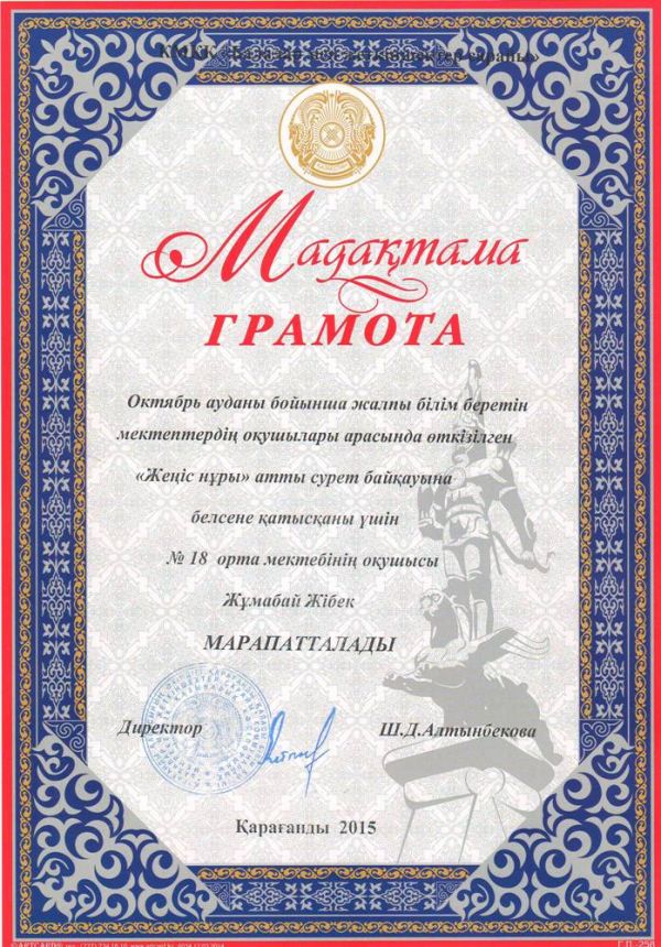 Ученица 10 класса Ешимханова Балжан участвовала в конкурсе "Юный юрист-2015" организованной университетом "Болашак " и награждена дипломом за лучшую номинацию "Отаншыл…