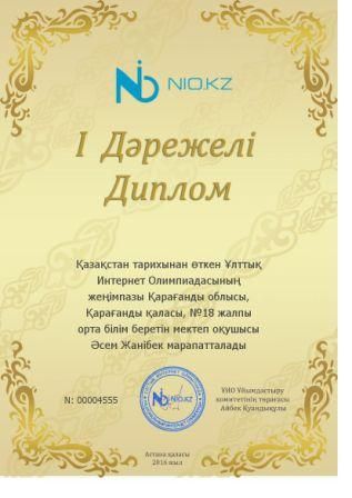 Тарих пәнінің мұғалімі Омарова Г.А. дүниежүзі тарихынан Nio.kz ұлттық интернет олимпиадасында жүлделі II орынды иеленді.