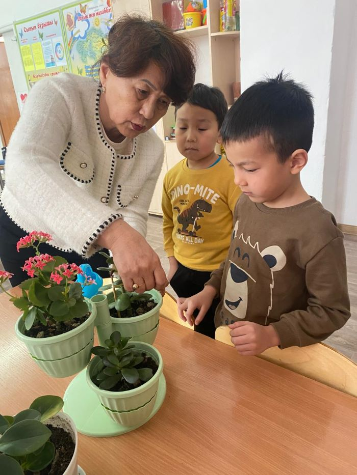 Мектепте айына 2 рет гүлдерді суғару, қопсыту, сұрыптау жұмыстарын жүргізу барысы.