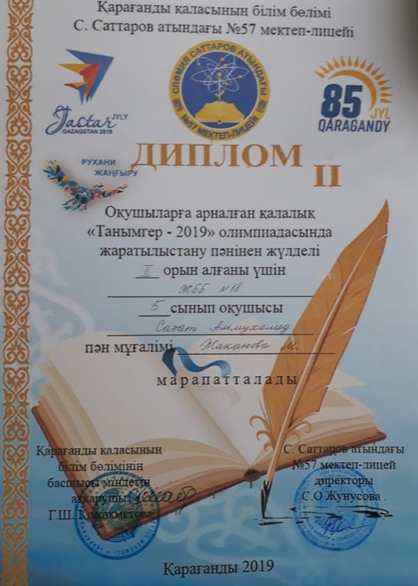 Қалалық «Танымгер-2019» олимпиадасында 5-сынып оқушысы Сағат Альмухамед жаратылыстану пәнінен жүлделі 2-орынды иеленді.Жетекшісі:Жаканова М