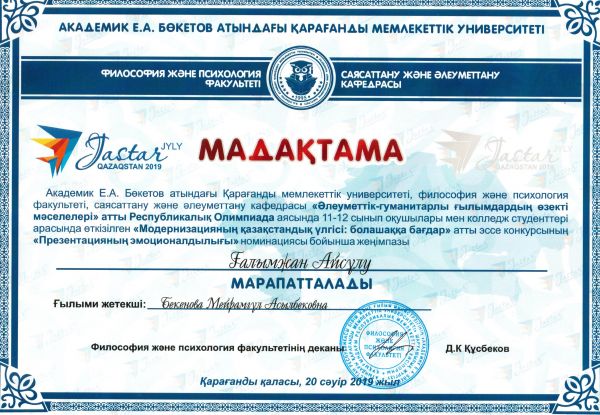 жеңіп алды.Жетекшісі:Смакова А.Ш