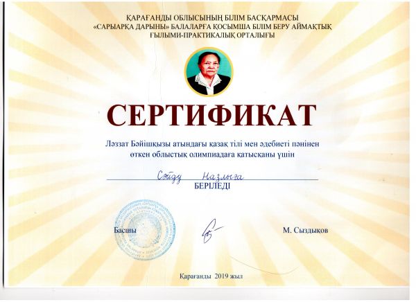 21.02.2019ж.күні Л.Бәйішқызы атындағы қазақ тілі мен әдебиеті пәнінен өткен облыстық олимпиадада 10 «ә»сынып оқушысы Сәйду Назлы жүлделі 3-орынды иеленді. Жетекшісі:Смакова А.Ш.