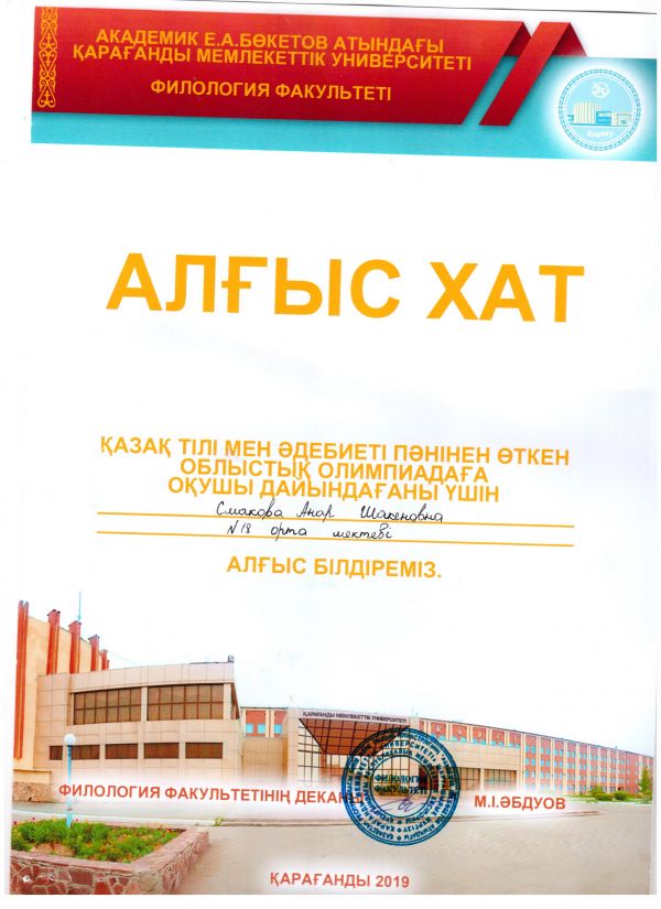 Қазақ тілі мен әдебиеті пәні мұғалімі А.Ш.Смакова 10 сынып оқушысын Л.Бәйішқызы атындағы облыстық олимпиадаға дайындағаны үшін «Алғыс хат» иеленді.