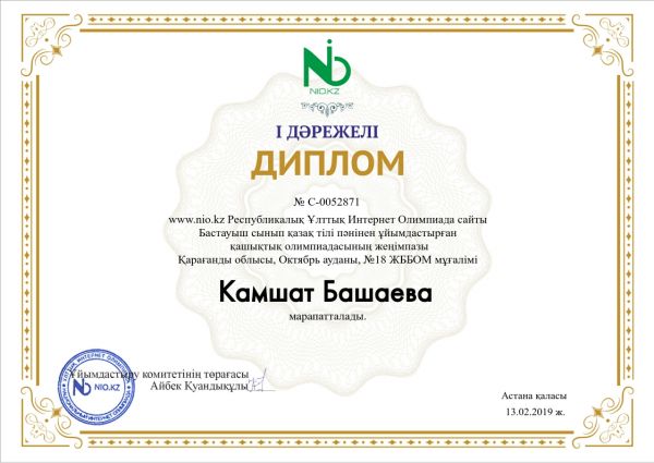 Бастауыш сынып мұғалімі К.Башаева ҰИО сайтында өткен қазақ тілі олимпиадасыны қатысып, жүлделі 1-орынды, дүниетану пәнінен 2-орынды иеленді.