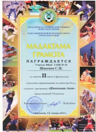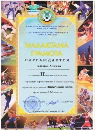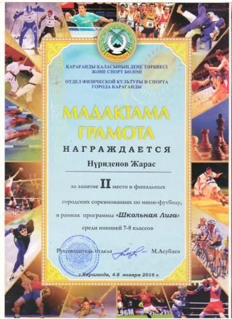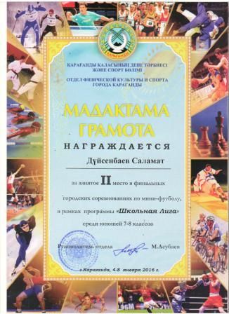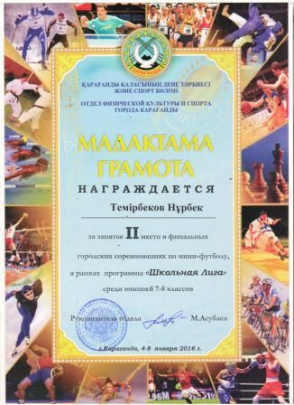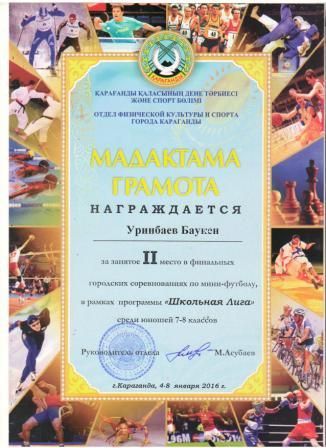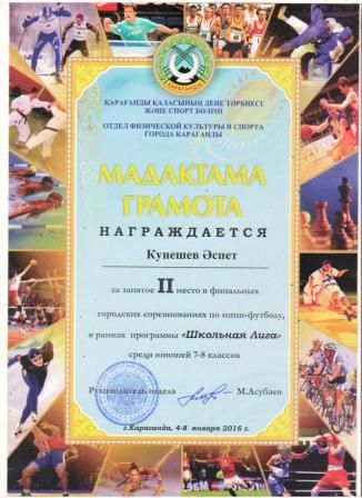 4-8 қаңтар 2016 ж. Қарағанды қаласының дене тәрбиесі және спорт бөлімі ұйымдастыруымен «Мектеп лигасы» бағдарламасы аясында өткен шағын-футбол қалалық сайыстың финалдық кезеңінде м…