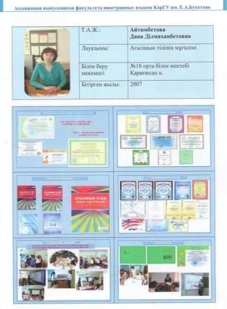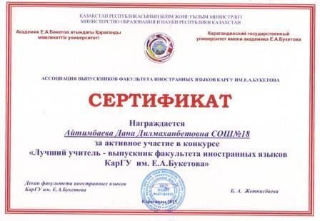 № 18 ЖББОМ КММ ағылшын тілі пәні мұғалімі Айтимбетова Дана Дилмаханбетовна ҚарМу-да өтілген облыстық байқауында «Ең үздік мұғалім  Е.А. Бөкетов атындағы ҚарМу  шетел тілдері…