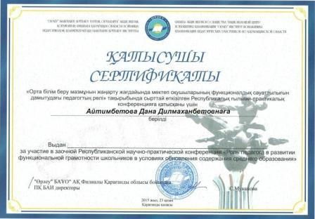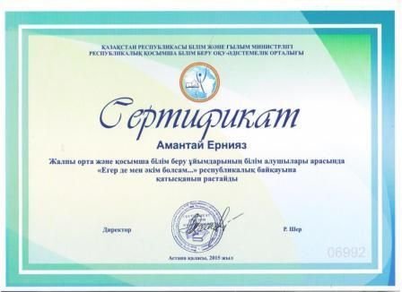 Жалпы орта қосымша білім беру ұйымдарының білім алушылары арасында «Егер де мен әкім болсам»атты тақырыбындағы Республикалық байқауына қатысқаны үшін 8 «А» сынып оқу…