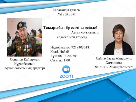 Мектебімізде 8 ақпан 2022 ж. күні Кеңес әскерлерінің Ауғанстан жерінен шағырылғанына 33 толуы аясында "Ер есімі-ел есінде!" тақырыбында ауған соғысының ардагері Оспанов Қайыржан Құра…