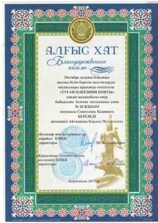 За активное участие в конкурсе «Туған өлкемнің бояуы», организованном для учащихся школ Октябрьского района, Балташ Торгын – 6а класс, Гаипова Альбина, Сейдуали Али – 8а клас…