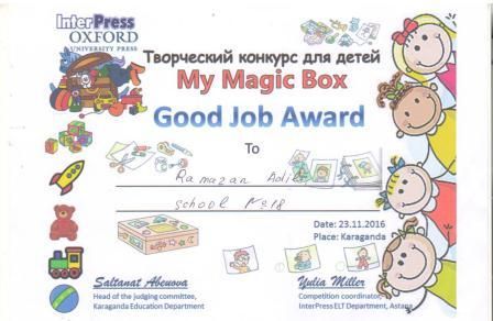 24 ноября 2016 года в СОШ №86 прошел городской конкурс «My magic box» в начальном звене. Учащиеся начального звена защищали свои проекты. Ученик нашей школы 4-класса Рамазан Адил з…