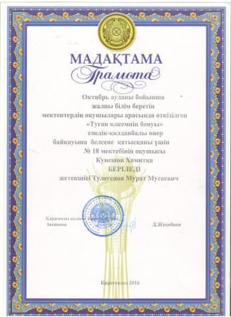 Среди учащихся общеобразовательных школ Октябрьского района прошел конкурс декоративно-прикладного искусства на тему “Туған өлкемнің бояуы”, по итогам которогоученики 7 «Ә» к…