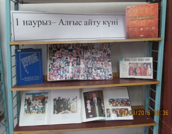 29.02.2016г. в школьной библиотеке прошла выставка, посвященнаяДню благодарности «1 наурыз –Алғыс айту күніне».