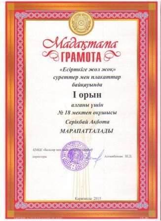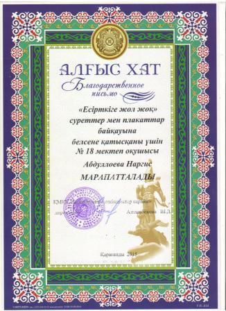 № 18 ЖББОМ КММ-нің 5«А» сынып оқушысы Төкенова Балғын Халықаралық қайырылымдық фестивальінің ән байқауында өнер көрсеткені үшін І дәрежелі дипломмен марапатталды.Жарайсың Балғын…