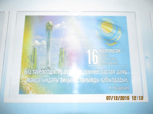 2015 жылдың 07 желтоқсан айында Қазақстан Республикасының 16 желтоқсан Тәуелсіздік Күніне орай мектеп дәлізінде стенді ілінді.