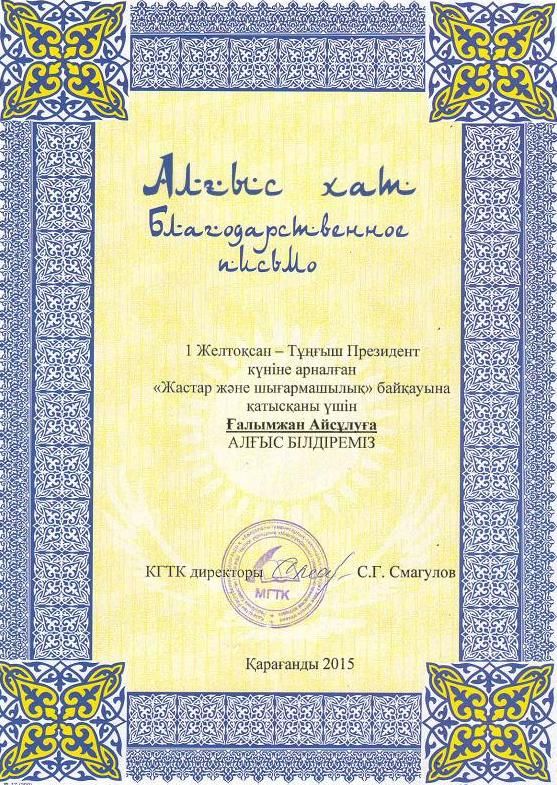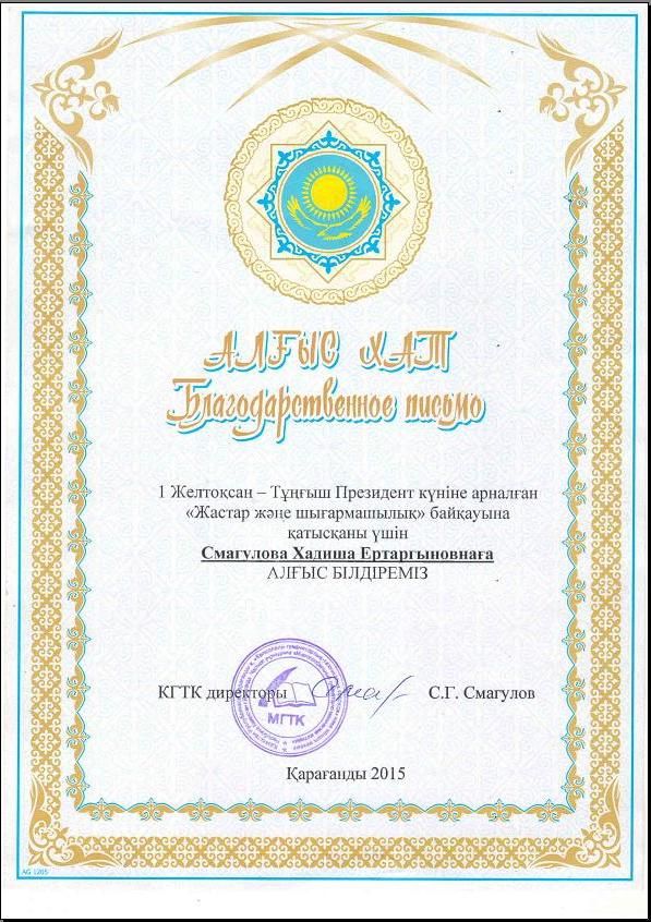 Смагулова Хадиша, ученица 9 «А», Ғалымжан Айсұлу, ученица 8 «А» класса, награждены благодарственными письмами за активное участие в конкурсе «Жа…