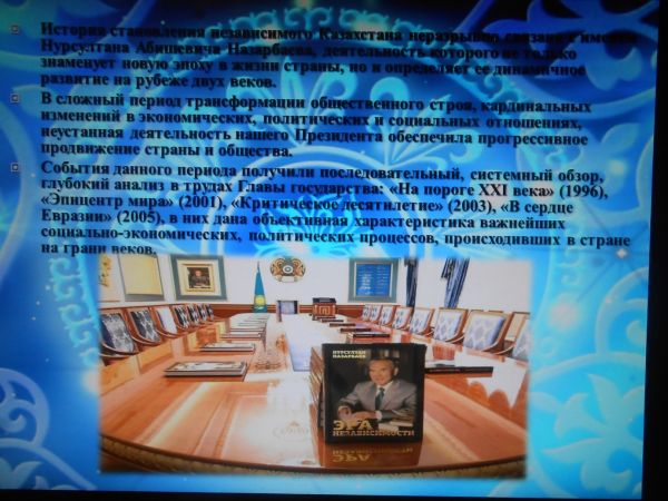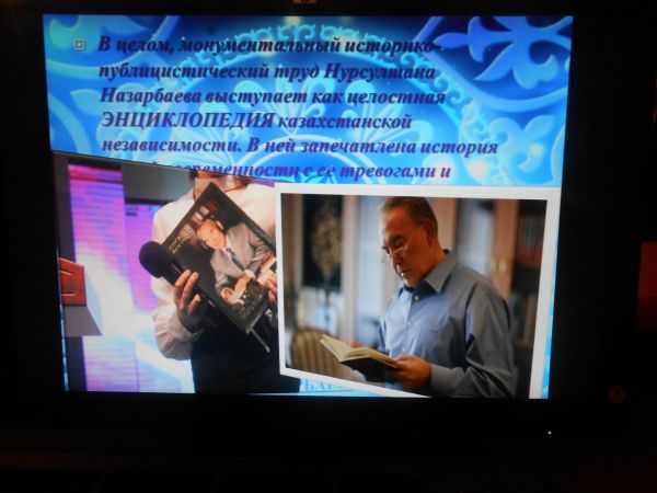 В библиотеке гимназии состоялась презентация книги Н.А.Назарбаева «Эра Независимости». В мероприятии активное участие приняли учащиеся 7-8 классов. С презентацией выступила шк…