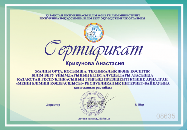Сертификатом за активное участие в Республиканском интернет-конкурсе «Лидер моей страны» в номинации «Что бы я мог сделать для процветания своей страны?» (сочинение &nd…