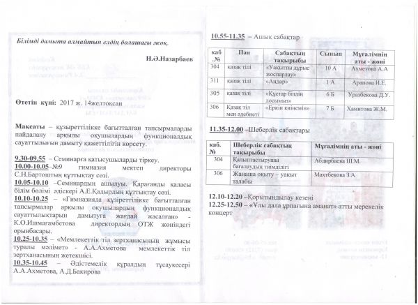 2017 жылдың 14 желтоқсанында Қарағанды қаласының №9 гимназияда «Құзыреттілікке бағытталған тапсырмалар арқылы оқушылардың функционалдық сауаттылығын дамыту» атты орыс мектептеріндегі қаз…