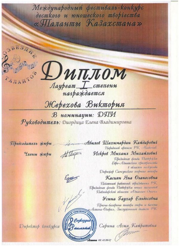 Поздравляем Жерехову Викторию, ученицу 4 «Б» класса, которая на Международном фестивале конкурсе детского и юношеского творчества «Таланты Казахстана» стала лауреатом 1 степе…