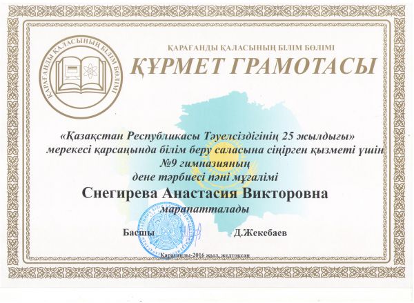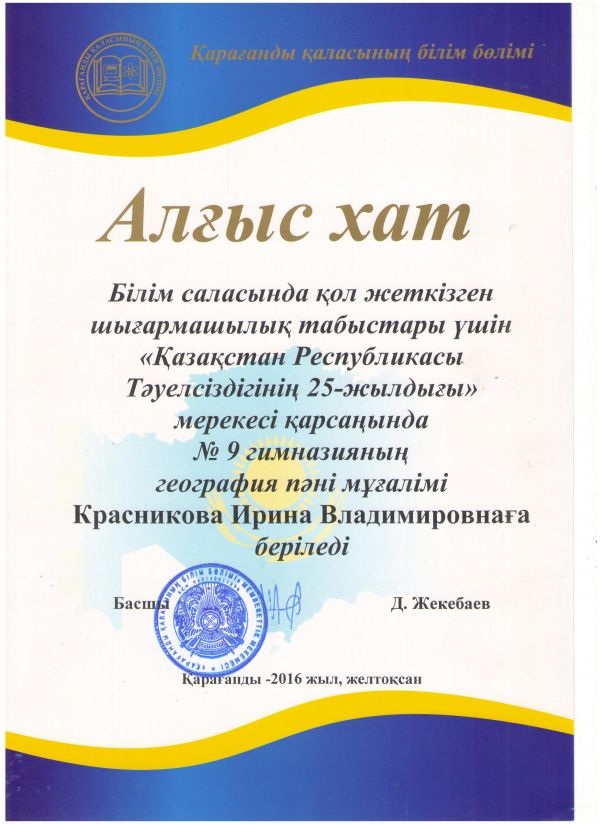 1.      Благодарственным письмом ГорОО награждается учитель географии КГУ «Гимназия № 9» Красникова Ирина Владимировна за вклад в развитие образования. 2. …