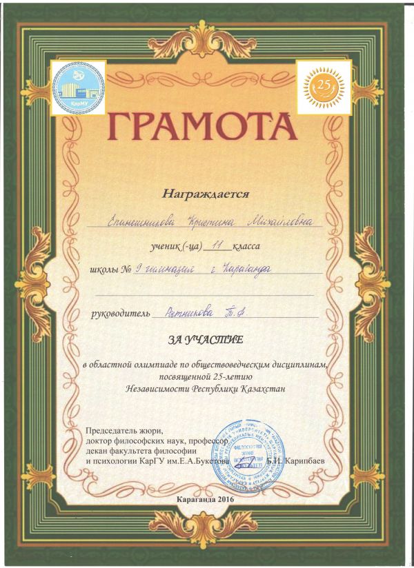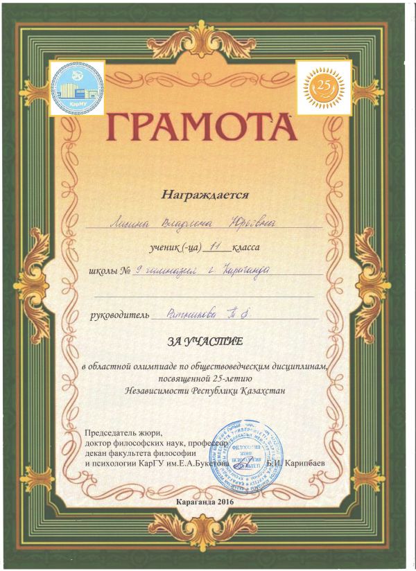 24.12.2016 года на базе кафедры философии, политологии и религиоведения Карагандинского государственного университета им. Е.Букетова прошла олимпиада по обществоведению среди учащихся старших классо…