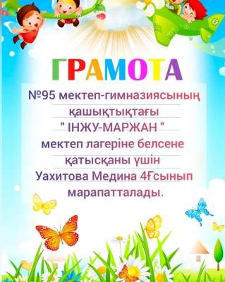 №95 мектеп-гимназиясының қашықтықтағы 30.07.2020 " ІНЖУ-МАРЖАН " мектеп лагеріне белсене қатысқаны үшін мына оқушыларды марапаттаймыз.