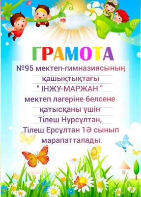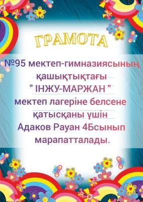 №95 мектеп-гимназиясының қашықтықтағы 30.07.2020 " ІНЖУ-МАРЖАН " мектеп лагеріне белсене қатысқаны үшін мына оқушыларды марапаттаймыз