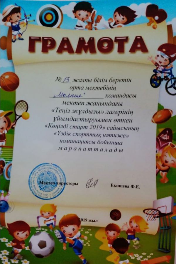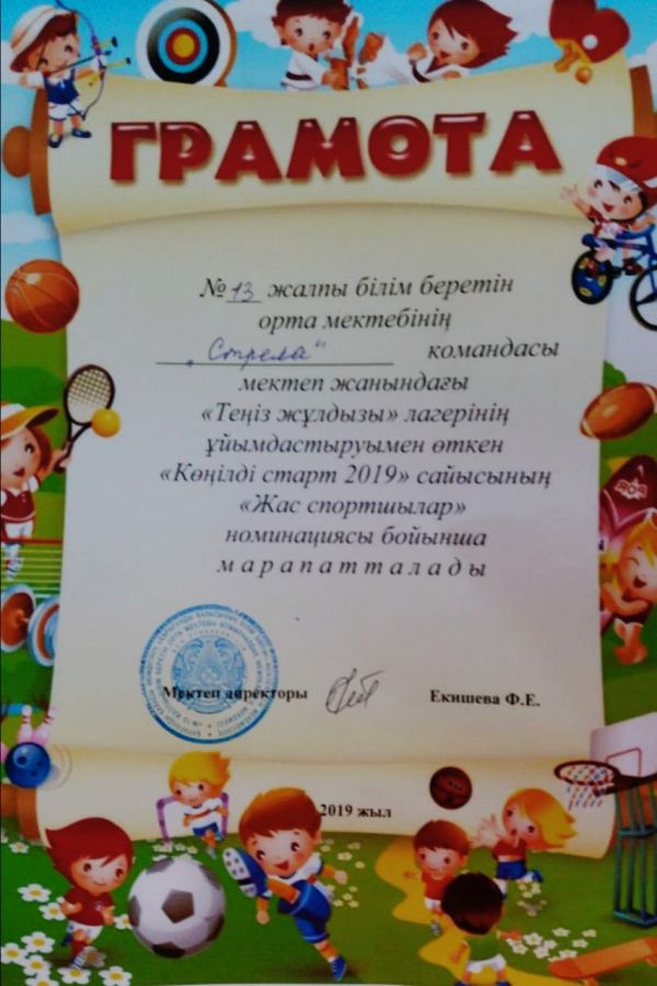 1 маусым 2019 жылы № 13 ЖББОМ "Теңіз жұлдызы" жазғы лагерінің ашылуына орай салтанаты жиын өтті. Күн таңертеңгілік жаттығудан басталды. Тәрбиешілер балаларды күн тәртібімен жән…