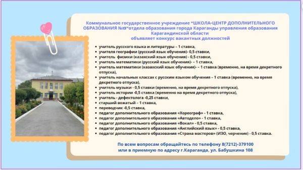 Қарағанды қаласы білім бөлімінің "№13 қосымша білім беру мектеп-орталығы" коммуналдық мемлекеттік мекемесі лауазымдардың бос орындарына орналасуға ко…