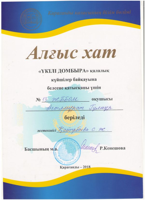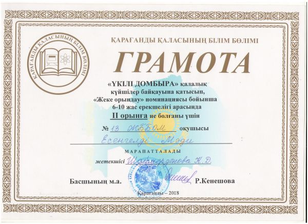 "Үкілі домбыра" қалалық күйшілер байқауына қатысып, "Жеке орындау" номинациясы бойынша 6-10 жас ерекшелігі арасында 2 орынға 4 "Ә" сынып оқушысы Есенгелді Мәди алды. Бе…