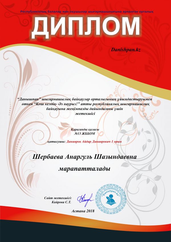 «Данышпан» шығармашылық байқаулар орталығының ұйымдастыруымен өткен «Қош келдің –Әз наурыз!» атты республикалық шығармашылық байқауға қазақ тілі мен әдебиет пәнінен 6 с…