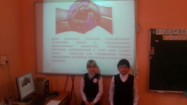 Ко Дню духовного согласия в 4 «А» и 4 «Б» классах был проведен классный час, на котором ребята познакомились с историей возникновения данного праздника, рассуждали над тем, ч…