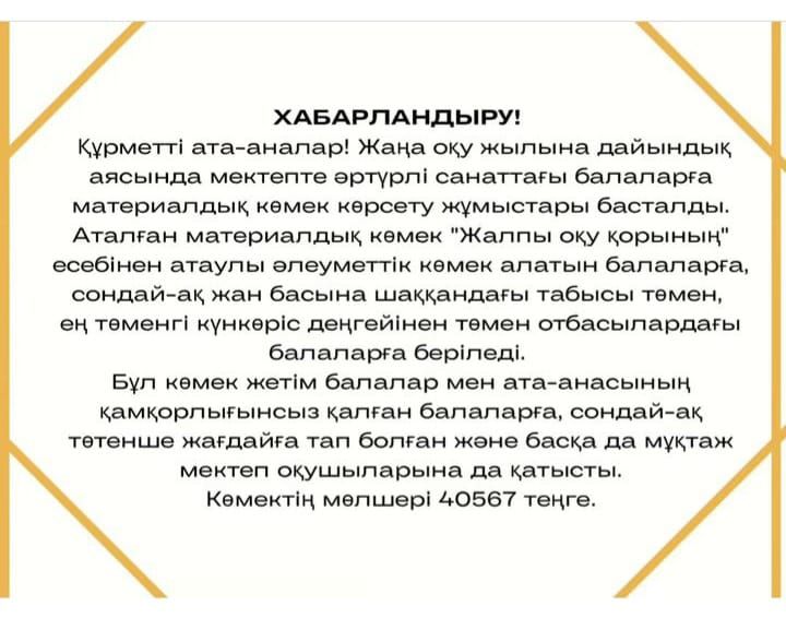 2023 жылдың 01 тамызынан "Мектепке жол" акциясы басталды. Жаңа оқу жылына аз қамтылған отбасы балаларына көмек көрсетем деген спонсорлар, демеушілер болса мектеп əкімшілігіне хабарласуға б…