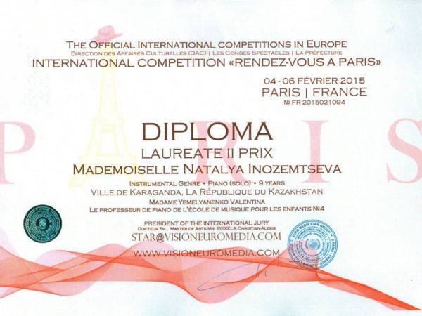 Ученица 3 «А» СОШ № 13 заняла в музыкальном конкурсе 1 – е место в Италии и 2 –е место во Франции.