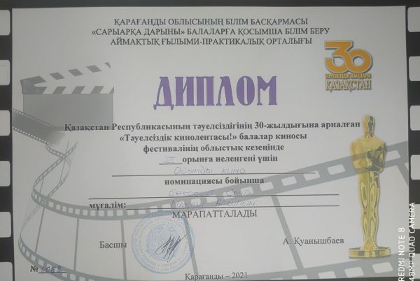 №13 ҚББМО 8 "Ә" сынып оқушысы Бексеит Әмір Қазақстан Республикасының тәуелсіздігінің 30-жылдығына арналған «Тәуелсіздік кинолентасы!» балалар киносы фестивалінің облыстық кезең…
