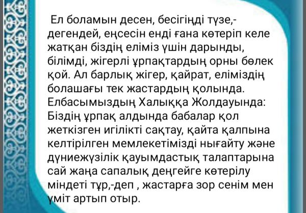8 "Ә" сыныбында "Жалынды жастар-Жарқын болашақ" тақырыбында қашықтықтан онлайн сынып сағаты өткізілді. Мақсаты: Әрбір қазақ жастары өздерін ұлтжандымын деп ұғынып, өне бойл…