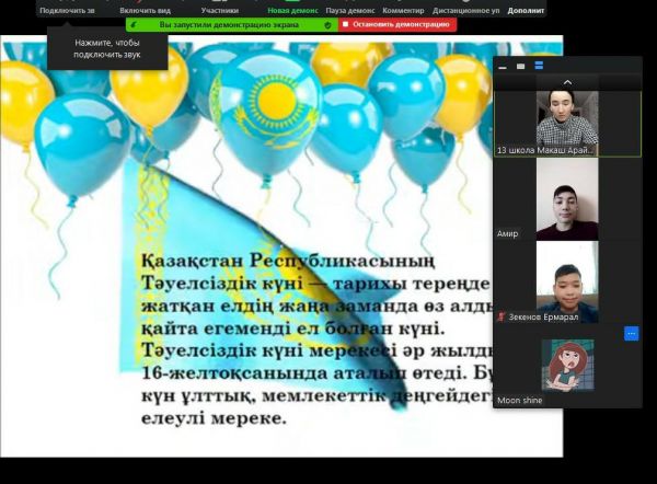 11.12.2020 күні 8 "Ә" қазақ сыныбымен ZOOM бағдарламасында "16 желтоқсан - Қазақстан тәуелсіздігін жариялаған күн" тақырыбында онлайн тәрбие сағаты өткізілді.