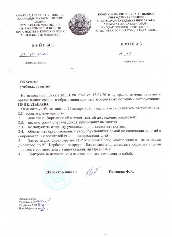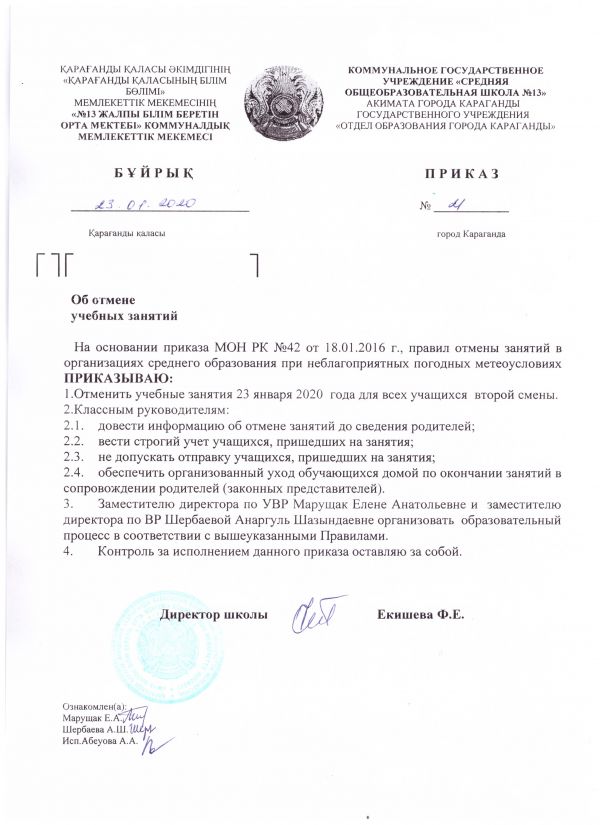 Отдел образования г.Караганды сообщает: 23 января 2020 года в связи с неблагоприятными погодными условиями занятия отменяются во ВСЕХ КЛАССАХ ВТОРОЙ СМЕНЫ