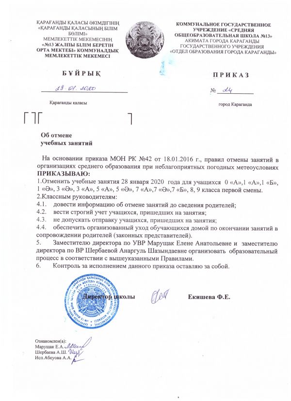 Отдел образования г.Караганды информирует : 28 января 2020 года в связи с неблагоприятными погодными условиями занятия отменяются во ВСЕХ КЛАССАХ ВТОРОЙ СМЕНЫ