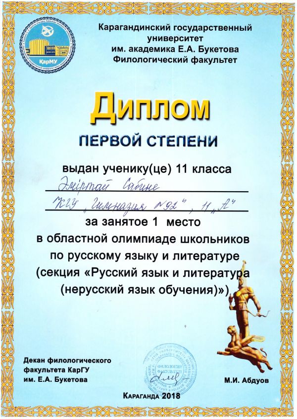 Е.А.Бөкетов атындағы ҚарМУ-інің филология факультеті орыс тілі мен әдебиет пәніне 2018 жылдың 24 ақпанын да облыстық олимпиада ұйымдастырып, гимназияның 11 сынып оқушысы Әміртай Сабина сол олимпиада…