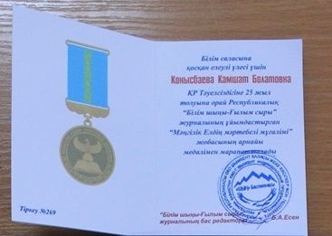 ҚР Тәуелсіздігіне 25 жыл толуына орай Республикалық "Білім шыңы - Ғылым сыры" журналының ұйымдастыруымен өткен "Мәңгілік Елдің мәртебелі мұғалімі" жобасының арнайы медалімен №92…