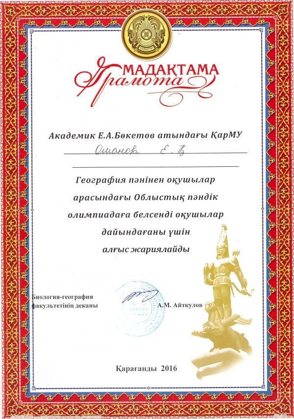 24.11.2016 жылы Академик Е.А.Бөкетов атындағы Қарағанды мемлекеттік университеті ұйымдастыруымен «Жас географ – 2016» облыстық олимпиадасы өтті.