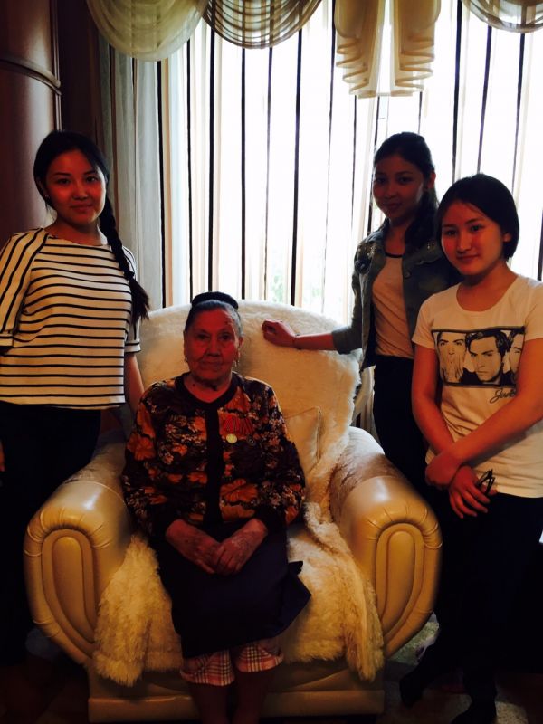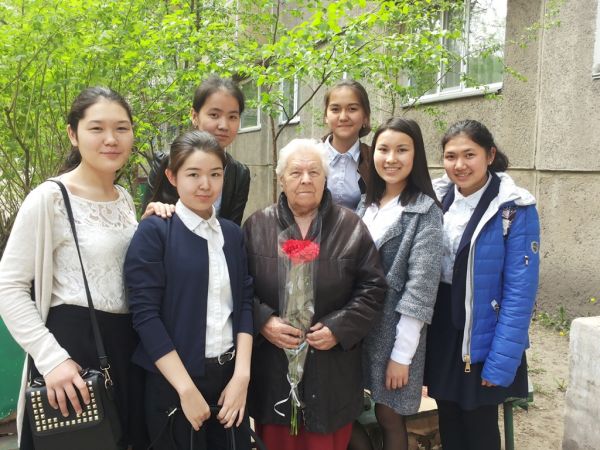 «№92 гимназия» КММ 10 «Б» сынып оқушылары және сынып жетекшісі Кушекова Айжан Жамбуловна ардагер Харрасова Хазер Абдуллаевнаны 9 мамыр Ұлы Жеңістің 70 жылдық мейр…