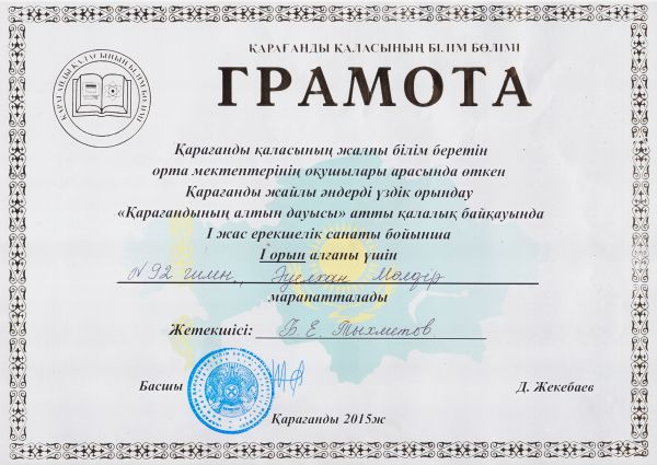 №92 гимназяның 1 "Б" сынып оқушысы Уалиева Айгерім "Звезды Евразии" Халықаралық шығармашылық жобасына қатысып, кубок және дипломмен марапатталды.