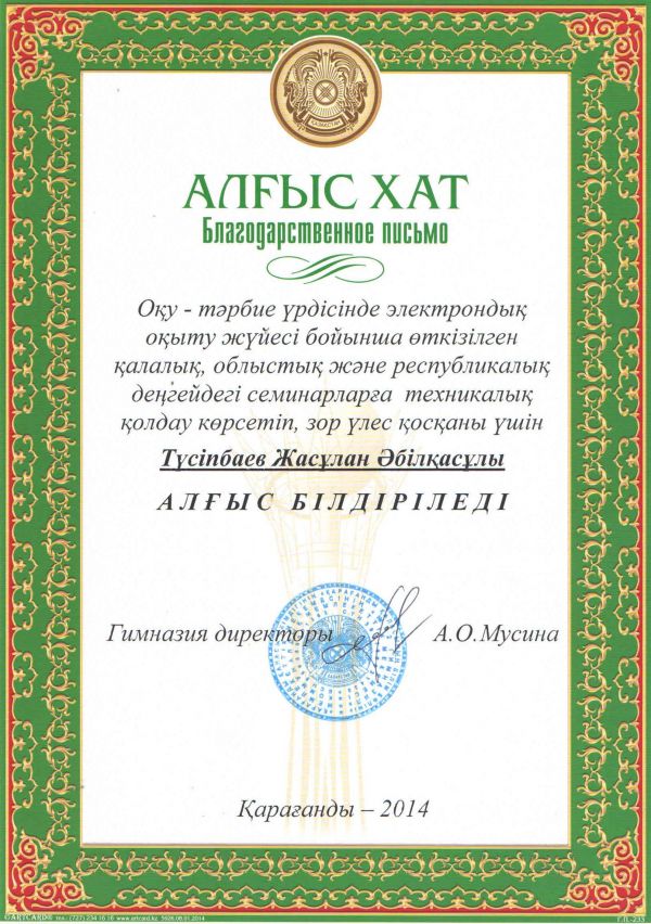 Оқу - тәрбие үрдісінде электрондық оқыту жүйесі бойынша өткізілген қалалық, облыстық және республикалық деңгейдегі семинарларға техникалық қолдау көрсетіп, зор үлес қосқандары үшін e-learning тобыны…