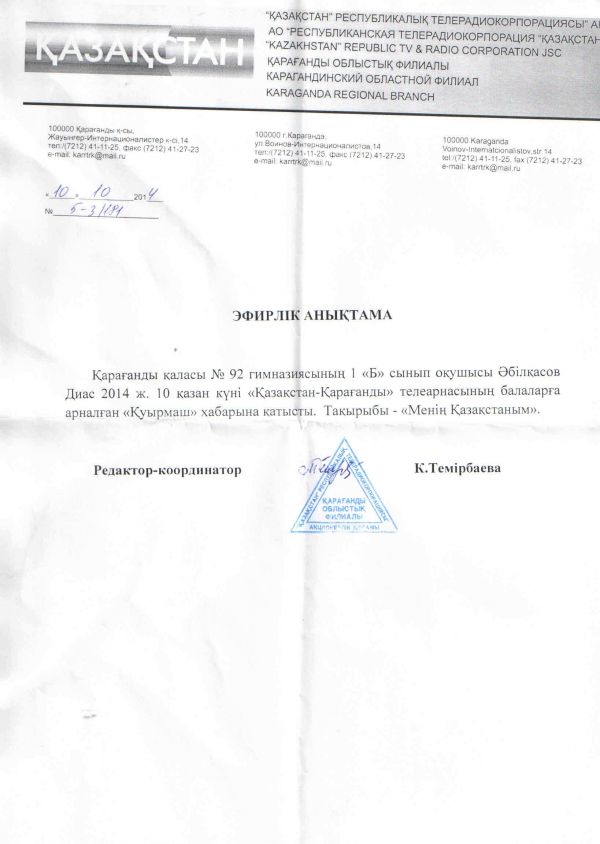 Қарағанды қаласы "№92 гимназия" КММ 1 "Б" сынып оқушысы Әбілқасов Диас "Қазақстан - Қарағанды" телеарнасының балаларға арналған "Қуырмаш" хабарына "Менің…
