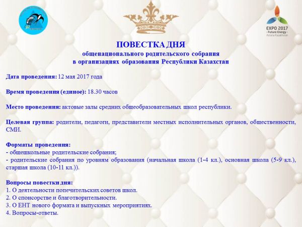 2017 жылдың 3 мамырында сағат 18.00-де Қарағанды облысы білім басқармасының басшысы А.Аймағамбетовтың төрағалығымен онлайн режимде облыстық ата-аналар жиналысы өтті.